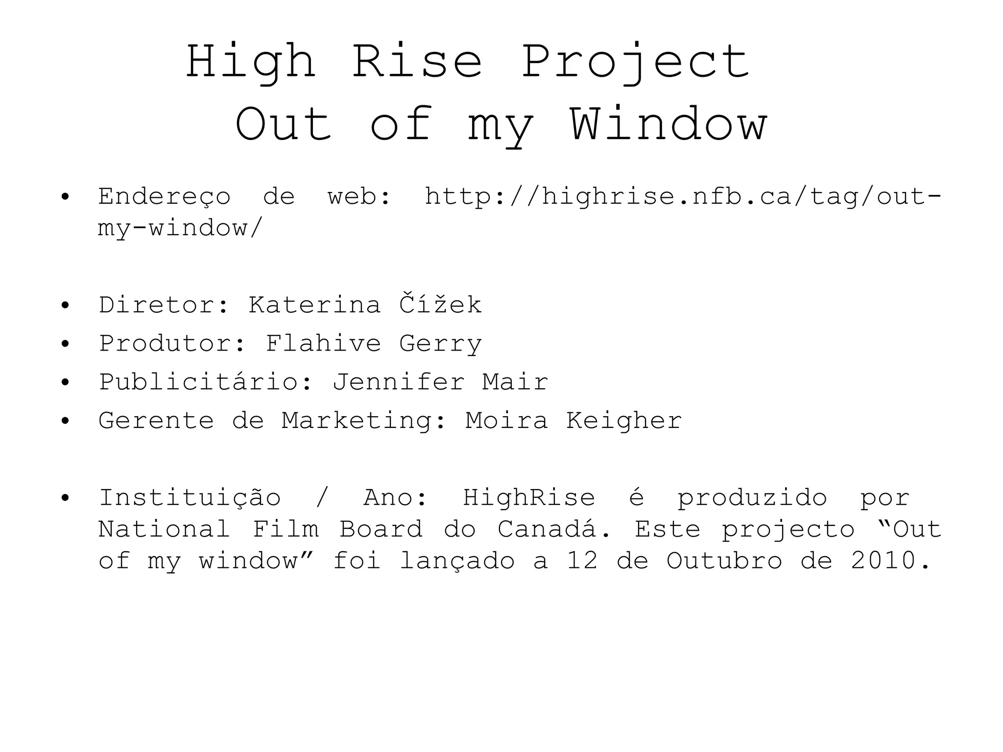 Este documento descreve o projeto "Out of my Window" da HighRise, que recolheu 90 minutos de filmagem documental de 13 cidades em 13 línguas, mostrando as perspectivas de mais de 100 pessoas sobre a vida nas cidades. O projeto visa partilhar histórias inspiradoras da comunidade através de fotografias e vídeos captados pelos próprios residentes nas suas janelas. A HighRise continua a expandir o projeto e a explorar novas formas de influenciar a percepção sobre a vida urb