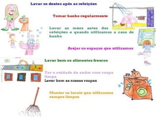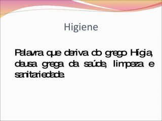 Higiene refere-se à limpeza e desinfecção do corpo para promover a saúde e prevenir doenças. Comportamentos higiénicos saudáveis incluem lavar as mãos, manter as unhas curtas e limpas, tomar banho regularmente e ter uma alimentação equilibrada, enquanto comportamentos não saudáveis incluem fumar e não lavar os dentes. Regras de higiene no trabalho incluem não espirrar sobre alimentos e manter locais de trabalho limpos.