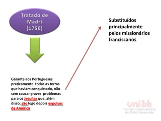 O documento discute a catequese e a colonização da América do Sul pelos jesuítas entre os séculos XVI e XIX. Ele descreve como a Audiência de Charcas concedeu permissão aos jesuítas para evangelizar a região do Chaco e fundar reduções, e como posteriormente os portugueses conquistaram essas terras causando problemas para os jesuítas, que foram expulsos e substituídos principalmente pelos franciscanos.