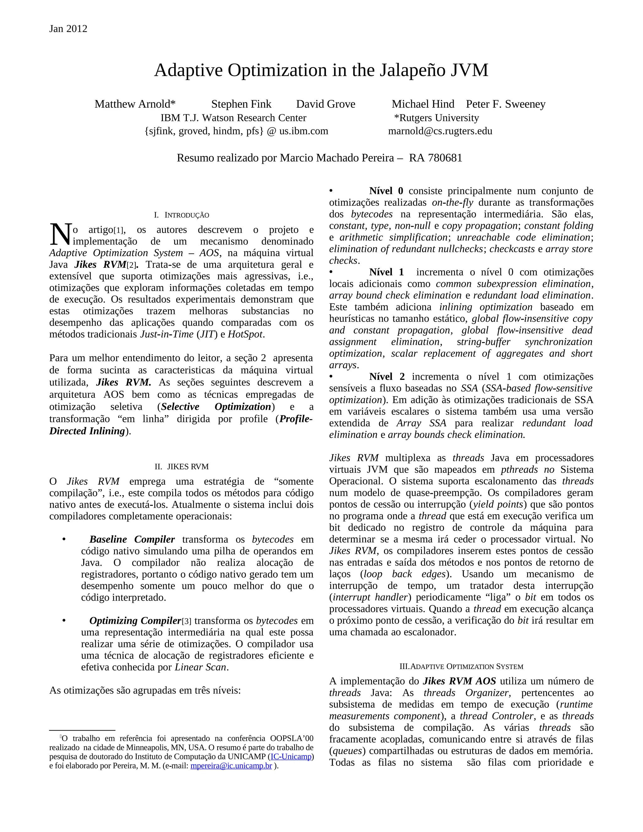 O documento descreve o Adaptive Optimization System (AOS) implementado na máquina virtual Java Jikes RVM. O AOS realiza otimizações seletivas identificando regiões de código quentes e direciona inlining com base em perfil de execução. O sistema coleta estatísticas em tempo de execução para guiar decisões de otimização de forma dinâmica e autônoma.