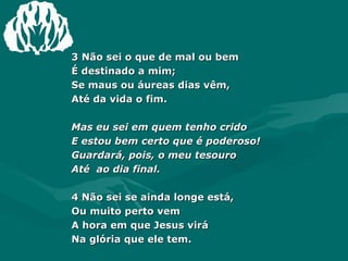 1. Os hinos celebram a fé dos crentes em Jesus como seu Salvador, apesar de não compreenderem totalmente os mistérios de Deus.