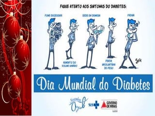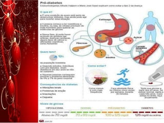 O documento discute a epidemiologia atual do diabetes no Brasil. Apresenta dados mostrando que a doença é mais comum em mulheres do que em homens e que pessoas com menos anos de estudo têm maior risco. Também destaca o forte crescimento de casos na faixa etária de 35 a 44 anos entre 2006 e 2012.