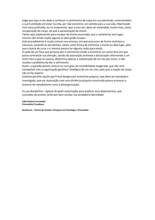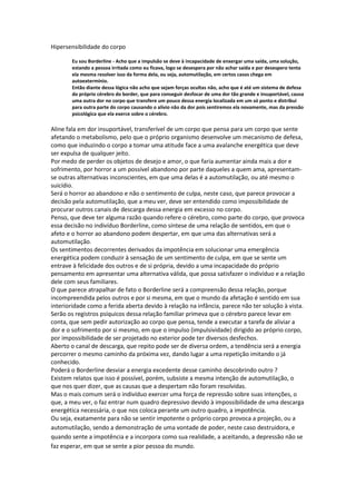 O documento discute os mecanismos psicológicos por trás da automutilação em pessoas com transtorno borderline. Afirma que a automutilação ocorre quando a pessoa se sente incapaz de lidar com uma "dor insuportável" e serve como um mecanismo de defesa do cérebro para transferir a energia da dor psicológica para o corpo físico. Também sugere que o medo do abandono pode levar à automutilação como forma de aliviar a angústia gerada por esse medo.