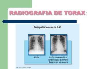 A hipertensão pulmonar é caracterizada pelo aumento da pressão arterial nos pulmões, levando a insuficiência do ventrículo direito. Os sintomas incluem falta de ar e fadiga com esforço. O diagnóstico envolve exames como ecocardiograma e cateterismo cardíaco. O tratamento foca na dilatação dos vasos pulmonares e no alívio dos sintomas, podendo incluir oxigenioterapia, medicamentos e transplante pulmonar em casos graves.