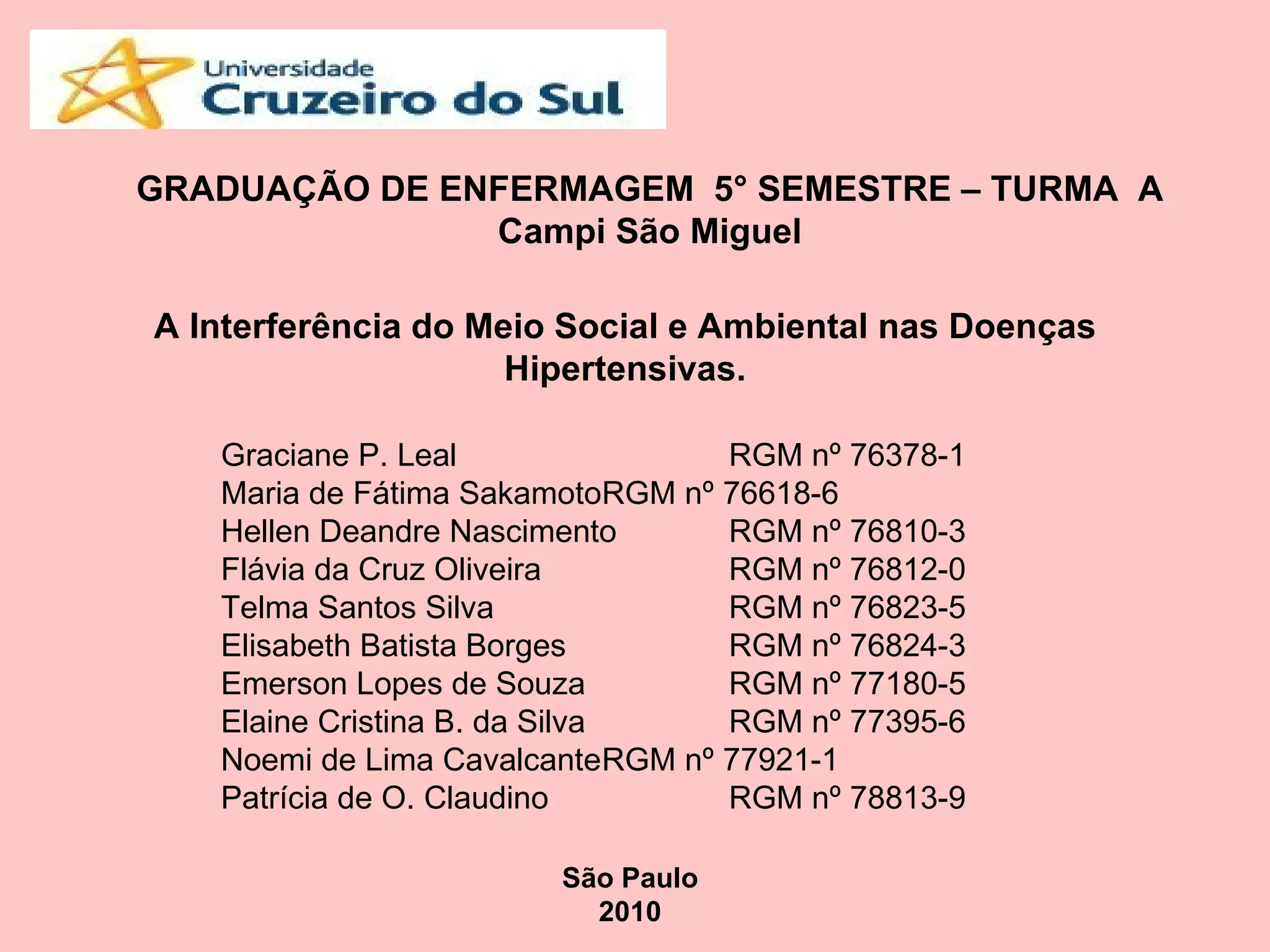 O documento discute a interferência de fatores sociais e ambientais nas doenças hipertensivas. Aborda a definição, classificação, epidemiologia, fisiopatologia e prevenção da hipertensão arterial, além de aspectos históricos, objetivos, fatores de risco e complicações como acidente vascular cerebral e infarto agudo do miocárdio. Conclui destacando a importância da promoção da saúde e prevenção de doenças para se viver com qualidade de vida mesmo tendo hipertensão.