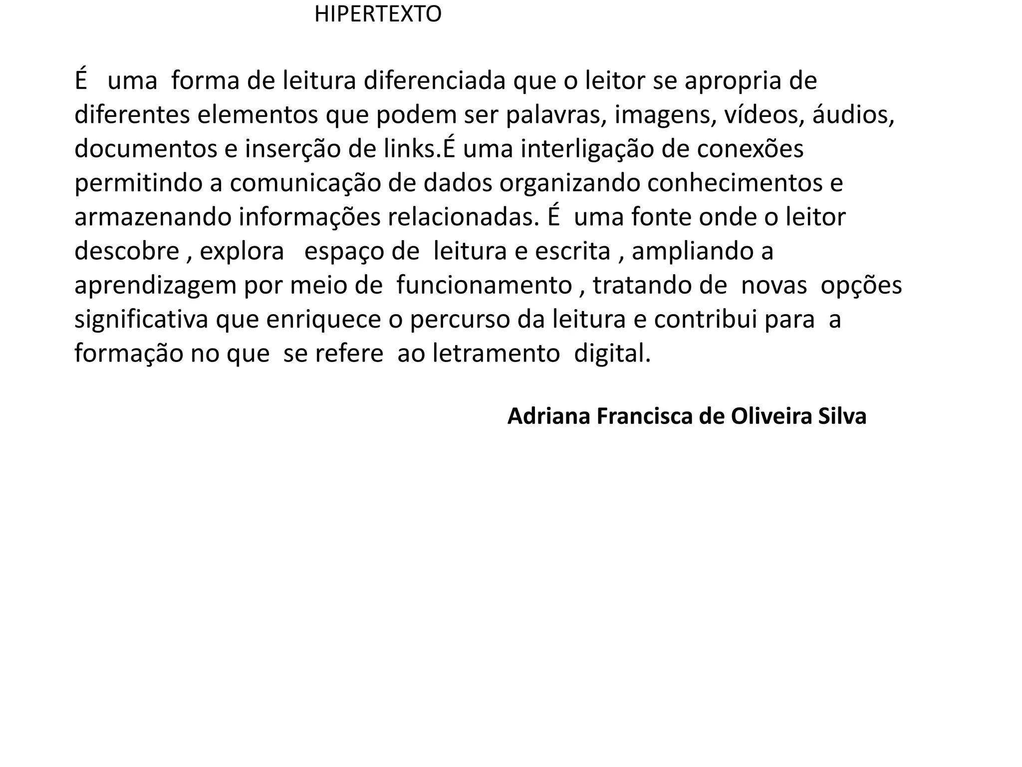 Hipertexto permite que leitores explorem conexões entre diferentes elementos como palavras, imagens e vídeos através de links. Isso organiza conhecimentos e armazena informações relacionadas, permitindo que leitores descubram e ampliem sua aprendizagem. O documento discute hipertexto e foi produzido durante um curso de pós-graduação sobre supervisão pedagógica e formação de professores.