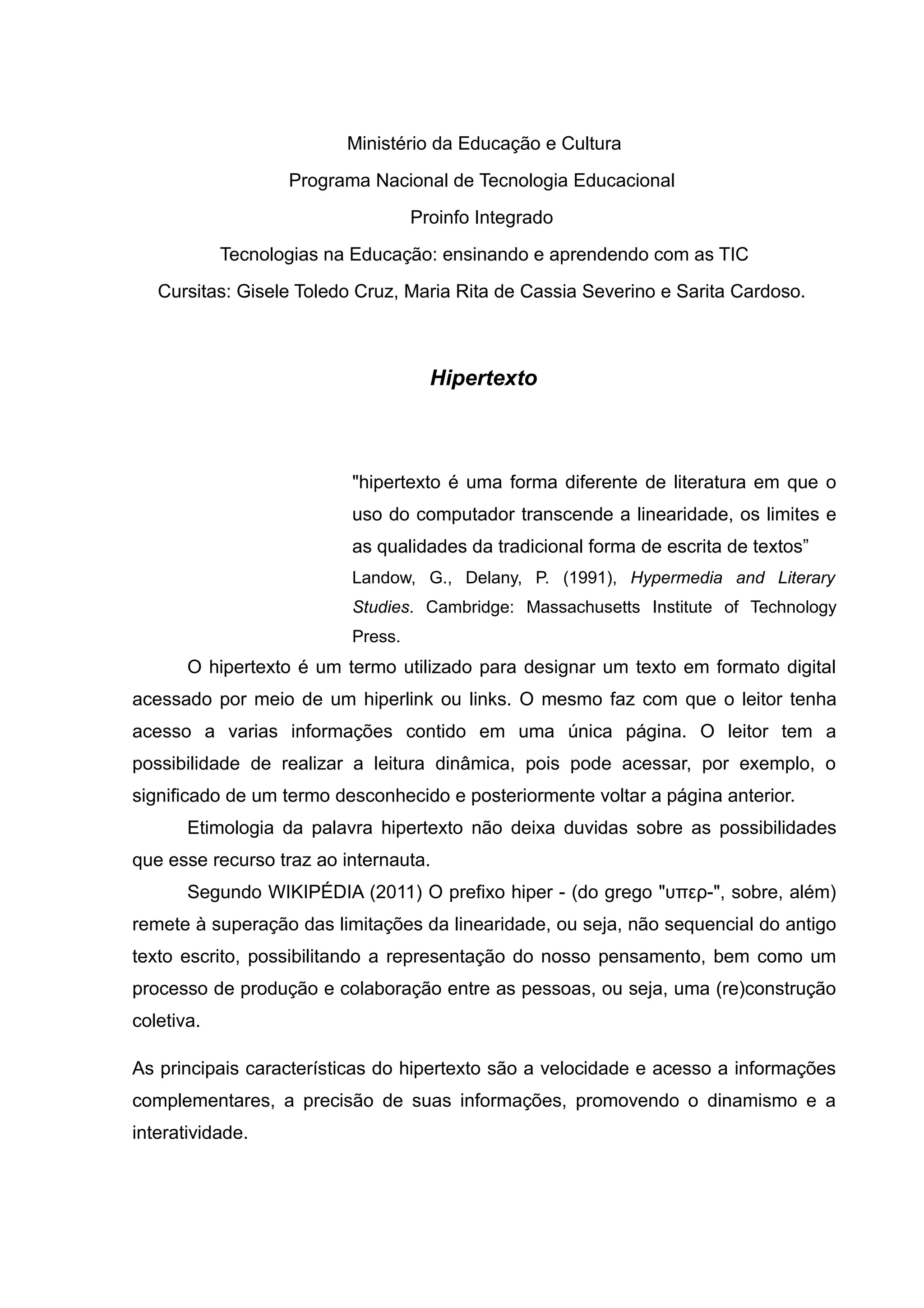 O documento discute o conceito de hipertexto, definindo-o como um texto digital acessado por hiperlinks que permite ao leitor navegar entre informações de forma não linear. Ele explica que o hipertexto transcende a linearidade dos textos tradicionais e permite acessar significados de termos e voltar páginas, proporcionando uma leitura dinâmica. Também destaca que o prefixo "hiper" refere-se à capacidade de superar limitações e possibilitar uma reconstrução colaborativa do conhecimento.
