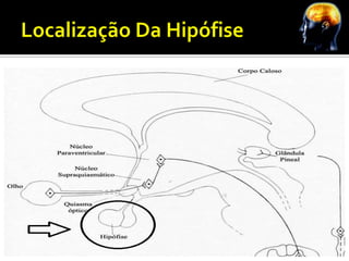 A hipófise é uma glândula localizada na base do cérebro que controla outras glândulas através de hormônios. Ela pode ser dividida em lobo anterior e posterior. O lobo anterior secreta seis hormônios importantes, incluindo o hormônio do crescimento e a adrenocorticotropina. O lobo posterior secreta a ocitocina e o hormônio antidiurético.
