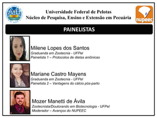 O documento discute hipocalcemia em ruminantes. O painel 1 apresenta um estudo sobre dietas com baixo balanço catiônico-aniônico pré-parto em vacas leiteiras, concluindo que dietas negativas por 21 ou 42 dias não afetam o desempenho pós-parto. O painel 2 analisa a associação entre hipocalcemia subclínica, balanço energético negativo e doenças no pós-parto, mostrando correlação com perda de peso corporal. O documento aborda inovações para