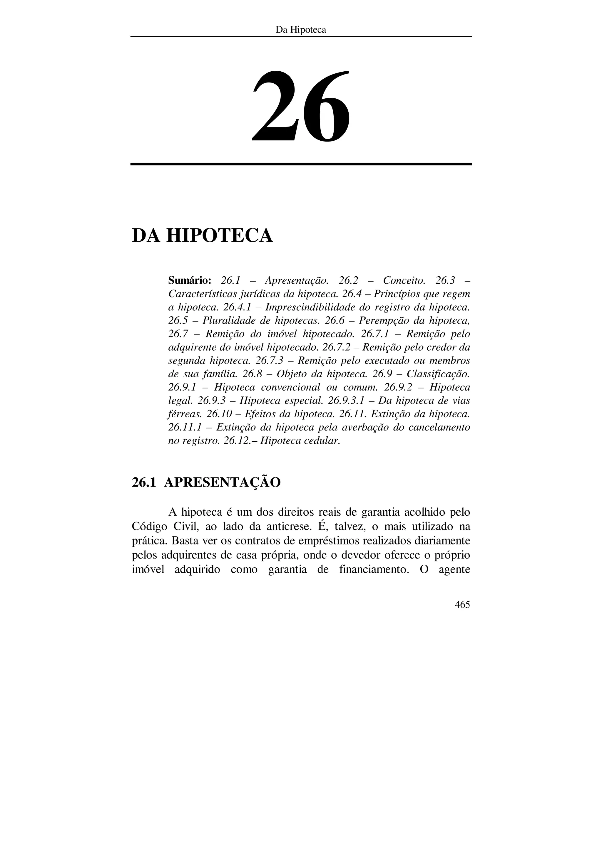 O documento descreve os conceitos e características jurídicas da hipoteca. A hipoteca é um direito real de garantia que permite ao devedor manter a posse do bem oferecido como garantia. Ela deve ser registrada e especificar o bem e a dívida garantidos para ter validade contra terceiros. A hipoteca é um direito acessório que se extingue quando a dívida principal for quitada.