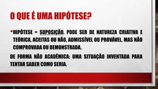 Uma hipótese é uma suposição ou situação inventada que ainda precisa ser comprovada ou demonstrada. Ela pode ser de natureza criativa ou teórica e serve para tentar entender como algo poderia ser ou ter sido caso determinadas condições fossem verdadeiras. Exemplos de hipóteses incluem "E se houvesse uma terceira guerra mundial?", "E se a água acabasse no planeta?" e "E se houvesse vida em Marte?".