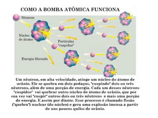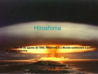 Em 6 de agosto de 1945, os Estados Unidos lançaram a primeira bomba atômica sobre a cidade de Hiroshima no Japão, matando mais de 250 mil pessoas. A bomba, chamada "Little Boy", foi lançada do bombardeiro B-29 Enola Gay e explodiu a cerca de 600 metros de altura, destruindo quase toda a cidade em um raio de 2 quilômetros e expondo a população a níveis extremamente altos de radiação.