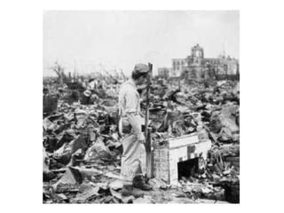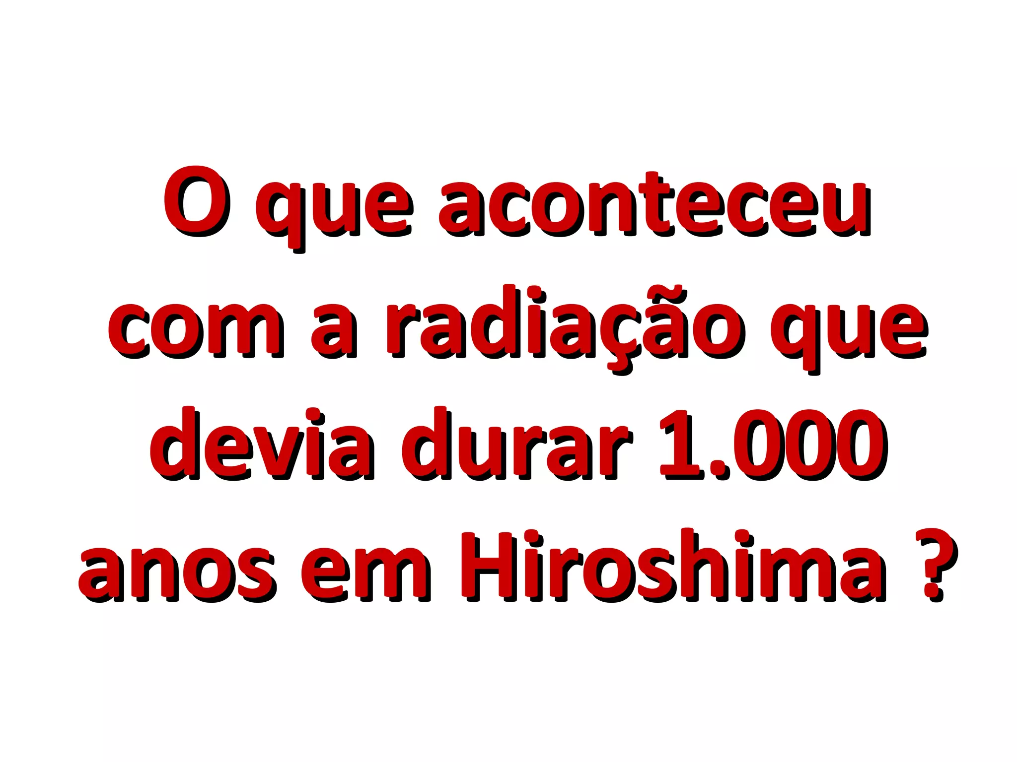 A radiação da bomba atômica em Hiroshima não durou os 1.000 anos previstos, 65 anos depois os níveis de radiação já haviam diminuído consideravelmente. O documento reflete sobre se a destruição causada pela bomba ou por políticos é maior a longo prazo, sugerindo que as ações de políticos podem ter consequências mais duradouras.