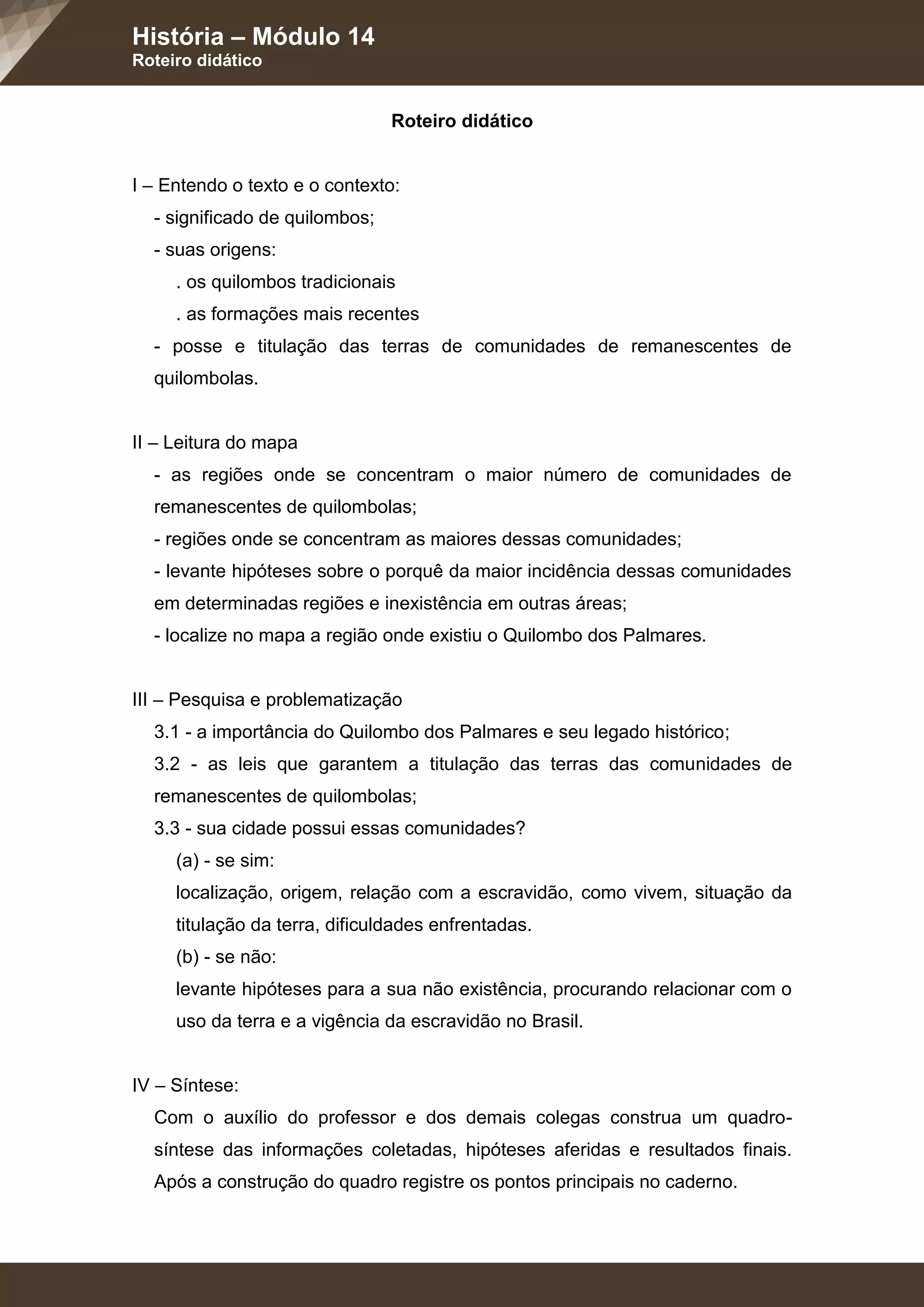 O documento apresenta um roteiro didático sobre quilombos com 4 seções: 1) entendimento do contexto histórico dos quilombos tradicionais e formações recentes e titulação de terras; 2) leitura de mapa para identificar regiões com maior incidência de comunidades quilombolas e localizar o Quilombo dos Palmares; 3) pesquisa sobre a importância do Quilombo dos Palmares, leis de titulação de terras e presença de comunidades na cidade; 4) síntese das informações coletadas