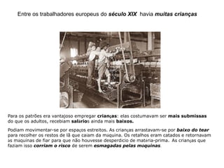 O documento descreve as duras condições de trabalho infantil no século XIX, quando crianças pequenas eram forçadas a trabalhar longas jornadas em fábricas e minas perigosas. Elas corriam risco de acidentes e eram punidas fisicamente se não mantivessem o ritmo das máquinas. Uma menina de oito anos relata seu medo ao abrir e fechar portas em uma mina às 3h da manhã.