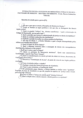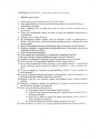 1. O documento apresenta 20 questões sobre História do Direito para uma prova, abrangendo temas como a Lei das XII Tábuas em Roma, a Constituição Política da República Romana, o Direito Civil, Pretoriano e das Gentes, a Jurisprudência Romana e a Compilação de Justiniano.