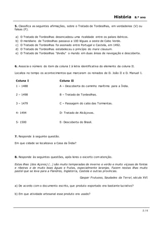 2. Aborda também o Tratado de Tordesilhas de 1494, que dividiu as terras a descobrir entre Portugal e Espanha, e eventos importantes dos reinados de D. João II e D. Manuel I, como a descoberta do