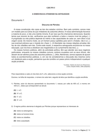 Este documento fornece informações sobre um teste intermédio de história, incluindo sua duração, data e versão, instruções para preenchimento da folha de respostas e cotação dos itens. Divide-se em quatro grupos abordando a democracia ateniense, a expansão portuguesa nos séculos XV-XVI, Portugal na virada dos séculos XIX-XX e o regime autoritário português entre guerras.