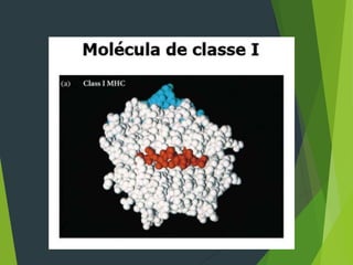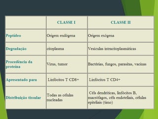 O documento descreve o complexo principal de histocompatibilidade (MHC), definindo-o como uma região de genes altamente polimórficos expressos na superfície celular. Descreve as propriedades e estrutura das moléculas do MHC de classe I e II, incluindo sua ligação de peptídeos antigênicos e apresentação para células T. Também aborda a genética, biossíntese e funções do MHC na resposta imune.