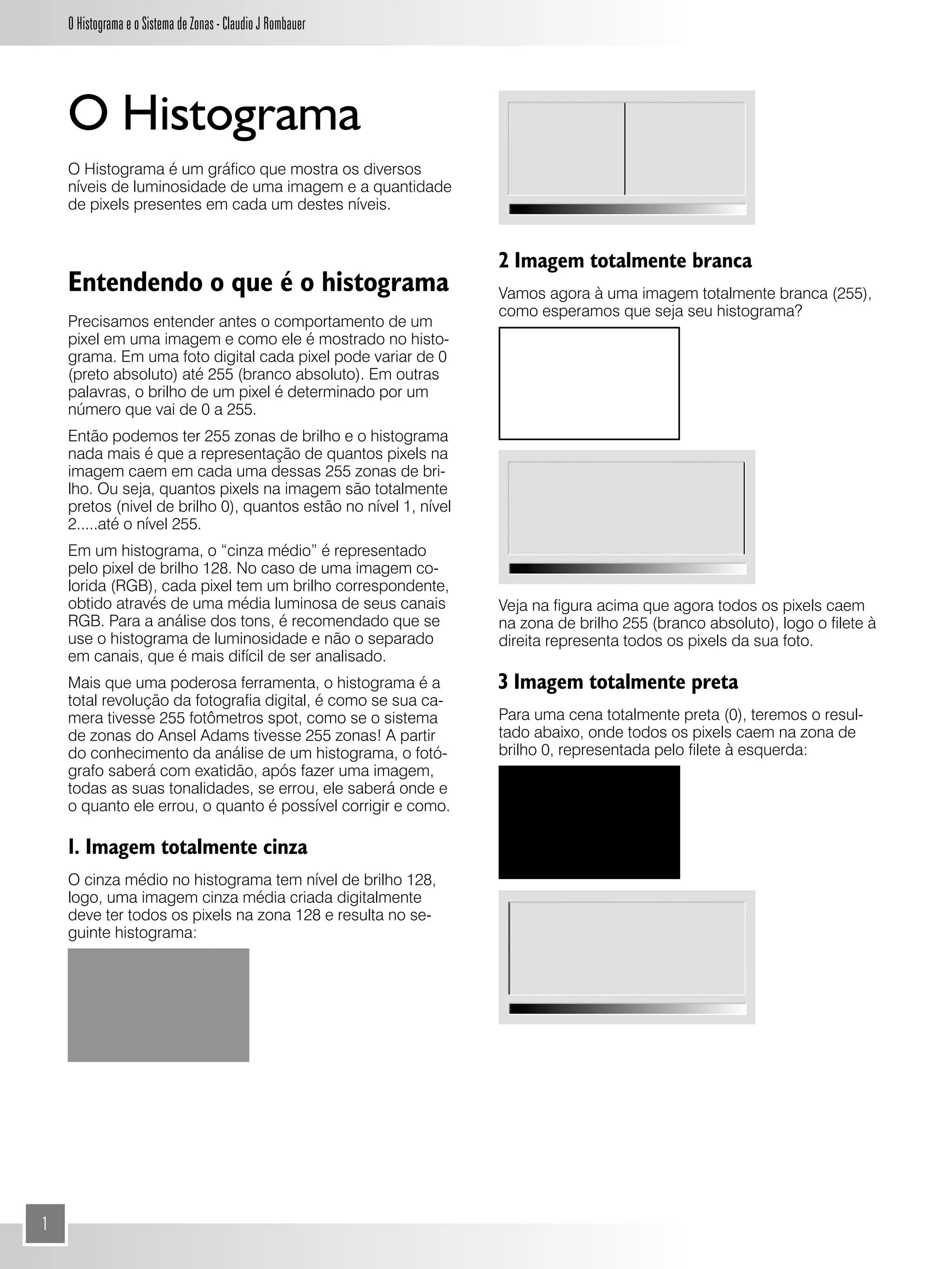 O documento explica conceitos básicos sobre histograma e exposição em fotografia digital, incluindo: (1) O histograma mostra a distribuição de tons de uma imagem; (2) Ele ajuda a analisar se a exposição capturou todos os detalhes ou se está queimada/escura; (3) Exemplos demonstram como diferentes cenas aparecem no histograma; (4) A exposição normal sugerida pela câmera nem sempre é correta, dependendo das condições.