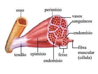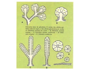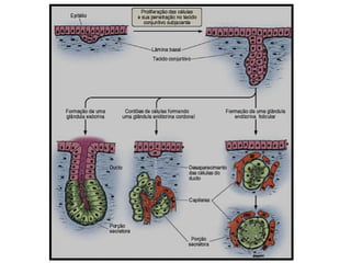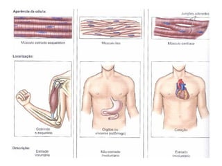 O documento descreve os principais tipos de tecidos do corpo humano, incluindo tecido epitelial, conjuntivo, muscular, nervoso e sanguíneo. Detalha as características, funções e subtipos de cada tecido, como os diferentes tipos de células que os compõem e a estrutura da matriz extracelular.