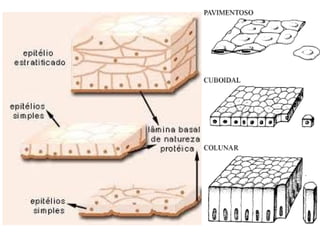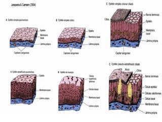 O documento descreve os principais tipos de tecidos do corpo humano, incluindo tecido epitelial, conjuntivo, muscular, nervoso e sanguíneo. Detalha as características, funções e subtipos de cada tecido, como os diferentes tipos de células que os compõem e a estrutura da matriz extracelular.