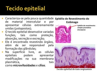 O documento descreve os principais tipos de tecidos do corpo humano: epitelial, conjuntivo, muscular e nervoso. Resume as características e funções de cada um, incluindo exemplos como a pele (epitelial), osso e sangue (conjuntivo), coração (muscular) e sistema nervoso (nervoso).