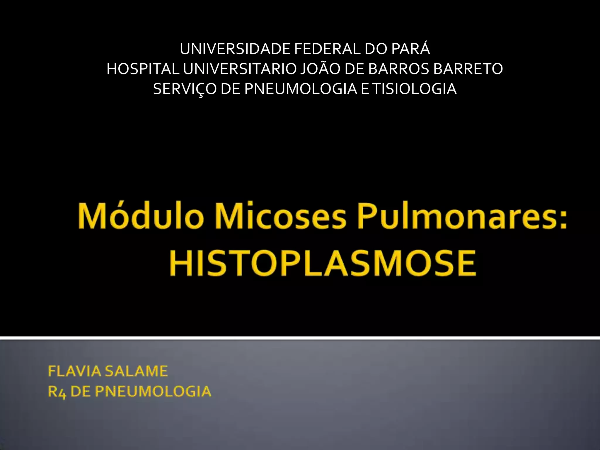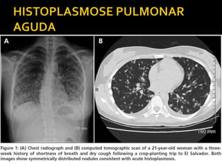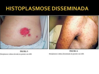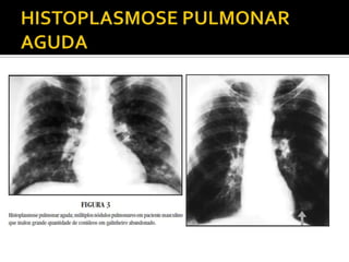 O documento descreve a histoplasmose, uma micose sistêmica causada pelo fungo Histoplasma capsulatum. Pode apresentar formas pulmonares, disseminadas e em órgãos. O tratamento depende da gravidade e imunidade do paciente, podendo incluir anfotericina B ou itraconazol.