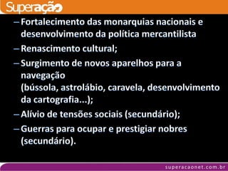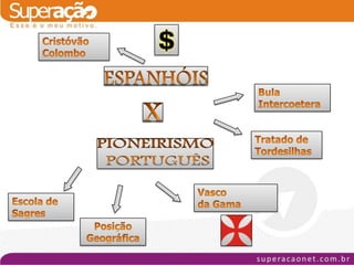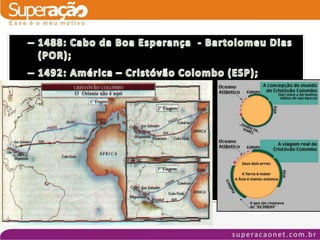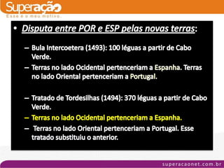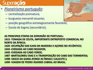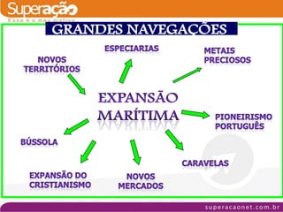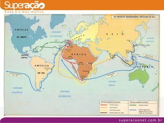 1) O documento descreve a expansão marítima europeia entre os séculos XV e XVII, notadamente os esforços de Portugal e Espanha para estabelecer colônias nas Américas e aumentar o comércio com a Ásia.