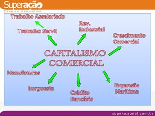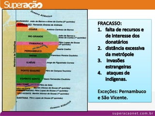2) Também resume a estrutura administrativa da colônia do Brasil, incluindo a divisão em capitanias hereditárias e o sistema de sesmarias.