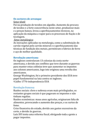 2) A revolução industrial começou na Inglaterra devido aos seus recursos naturais, mercado e disponibilidade de mão-de-obra. Os setores têxtil e metalúrgico foram pioneiros na aplicação de máquinas.