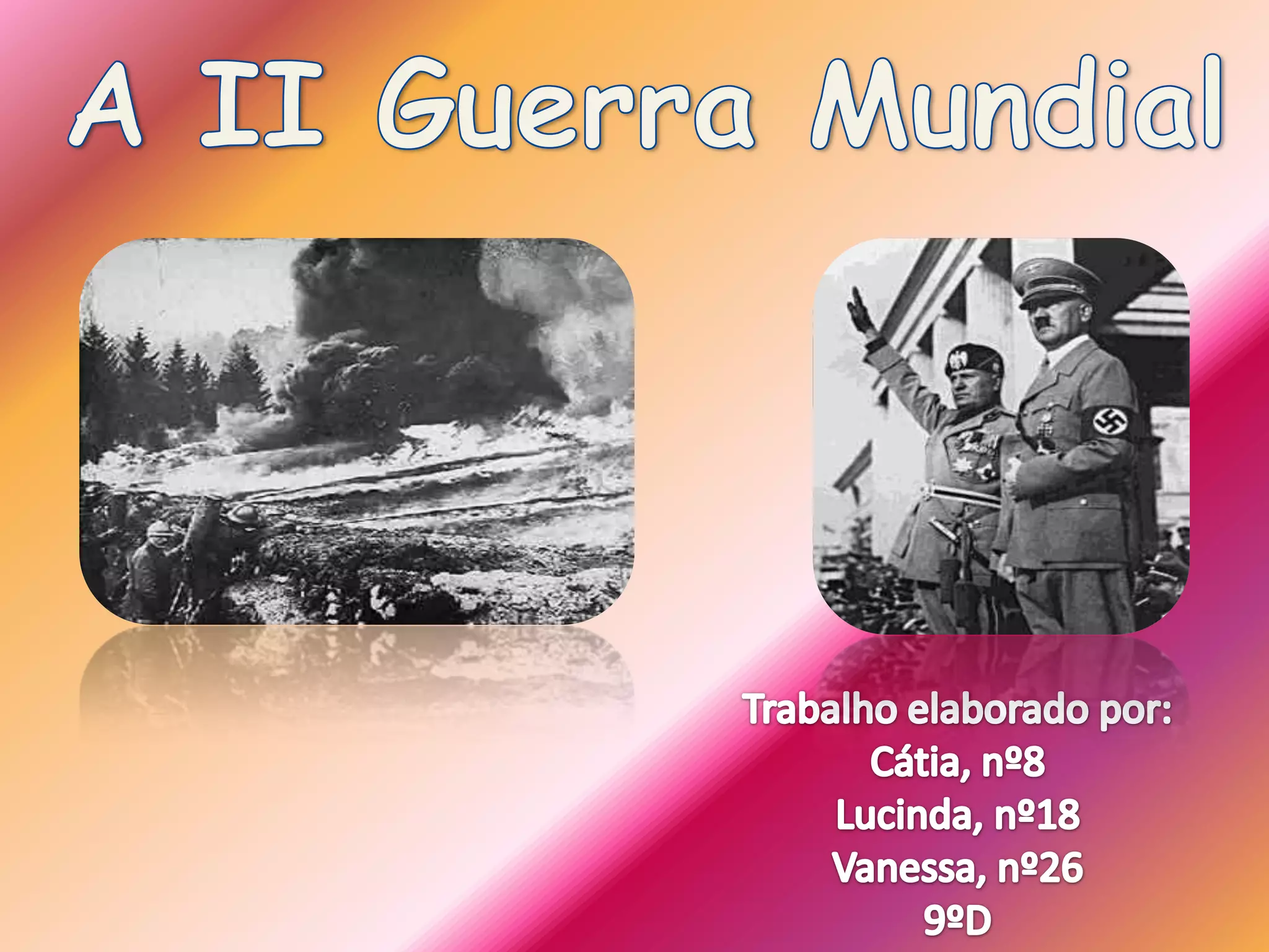 A Segunda Guerra Mundial (1939-1945) foi o conflito mais mortal da história, envolvendo a maior parte dos países do mundo. Foi provocada por regimes autoritários na Alemanha, Itália e Japão que queriam expandir sua influência. Após anos de combates, os Aliados (EUA, Grã-Bretanha, União Soviética e outros) derrotaram o Eixo com a rendição da Alemanha em 1945 e do Japão em agosto de 1945.