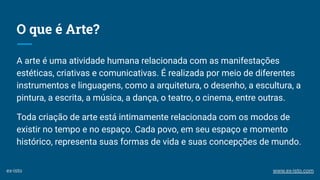 O documento traça um panorama da história da arte ocidental, destacando diferentes períodos e suas características, desde a arte pré-histórica até o art nouveau. Ele aborda a evolução da arte em resposta a contextos sociais, culturais e históricos, enfatizando como as expressões artísticas refletem os modos de vida e a visão de mundo de cada época. Cada estilo é apresentado com suas principais características, artistas notáveis e obras representativas.