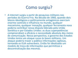 A Internet surgiu de pesquisas militares dos EUA durante a Guerra Fria para permitir a troca descentralizada de informações entre bases. Hoje é uma rede global de computadores conectados que permite o acesso e compartilhamento de informações. Apesar de seus benefícios, traz também riscos como acesso a pornografia e violação de privacidade que requerem cuidados de pais e educadores.
