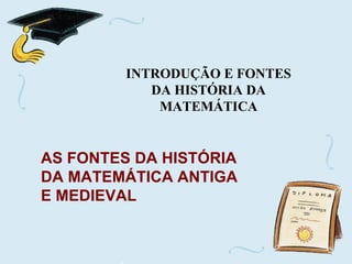 Este documento discute as principais fontes históricas para o estudo da matemática antiga e medieval, incluindo inscrições, papiros e tabletas de argila encontradas no Egito Antigo, Mesopotâmia e Grécia. Detalha os desafios de interpretar essas fontes e como sua decifração no século 19 permitiu uma melhor compreensão da matemática dessas civilizações.