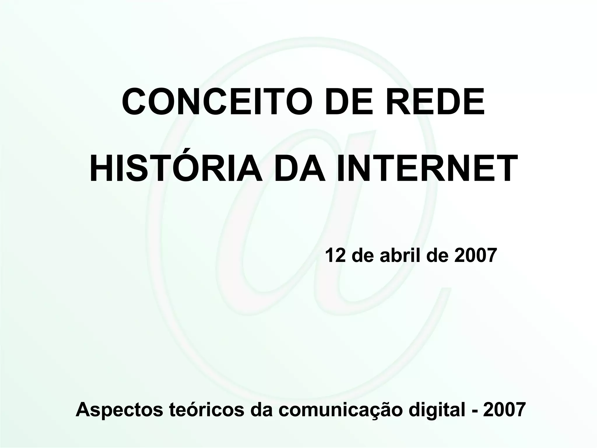 O documento descreve a história da Internet, começando com sua criação pela ARPA nos EUA durante a Guerra Fria para fins de defesa e pesquisa. A ARPA contratou cientistas que desenvolveram a primeira rede de computadores distribuída (ARPANET) em 1968, dando origem à Internet. Em 1972, ocorreu o primeiro e-mail enviado entre computadores e, em 1974, o protocolo TCP/IP permitiu a compatibilização entre máquinas diferentes, consolidando a Internet.