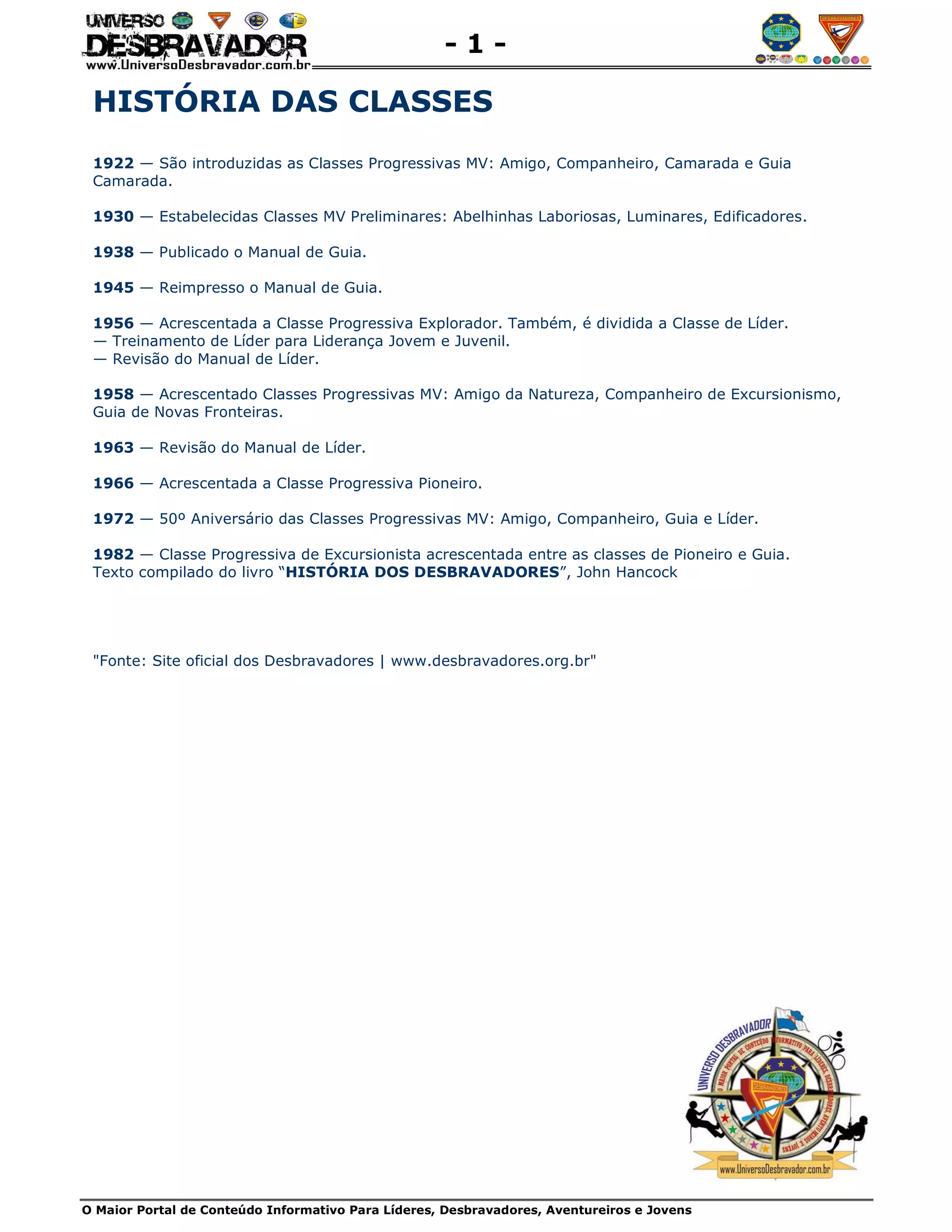 Este documento resume a história das classes progressivas do movimento escoteiro brasileiro desde sua introdução em 1922, com a adição de novas classes ao longo dos anos como Explorador em 1956 e Pioneiro em 1966, até a última revisão em 1982.