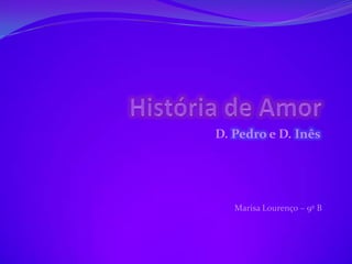 D. Pedro e D. Inês de Castro tiveram um amor proibido no século XIV em Portugal. D. Inês era aia da primeira esposa de D. Pedro e os dois se apaixonaram, gerando conflito com o rei Afonso IV. Após a morte da esposa de D. Pedro, D. Inês passou a viver com ele e teve 4 filhos, mas foi assassinada por ordem do rei. D. Pedro fez de D. Inês rainha após sua morte.