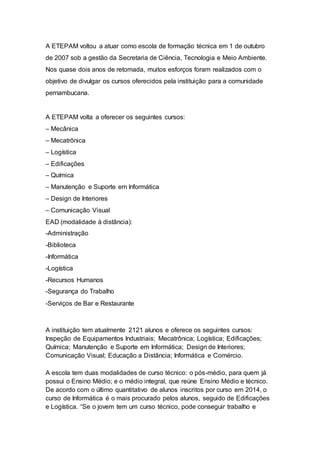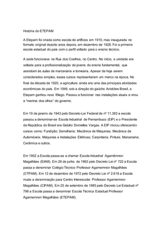 A ETEPAM foi criada em 1910 como uma escola de artífices e inaugurada em 1928 como a primeira escola estadual do Brasil voltada para o ensino técnico. Ao longo dos anos, a escola mudou de nome e localização várias vezes e passou a oferecer novos cursos técnicos. Atualmente, a ETEPAM oferece cursos técnicos presenciais e a distância em áreas como informática, edificações e logística.