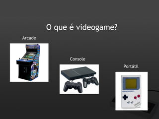 O documento traça a história e evolução dos videogames, desde os primeiros jogos em 1947, passando pelas gerações dos consoles de 8 a 16 bits até os portáteis e as gerações atuais de 32 e 64 bits. É descrito o surgimento dos arcades e consoles portáteis e como cada geração trouxe avanços gráficos e de processamento.