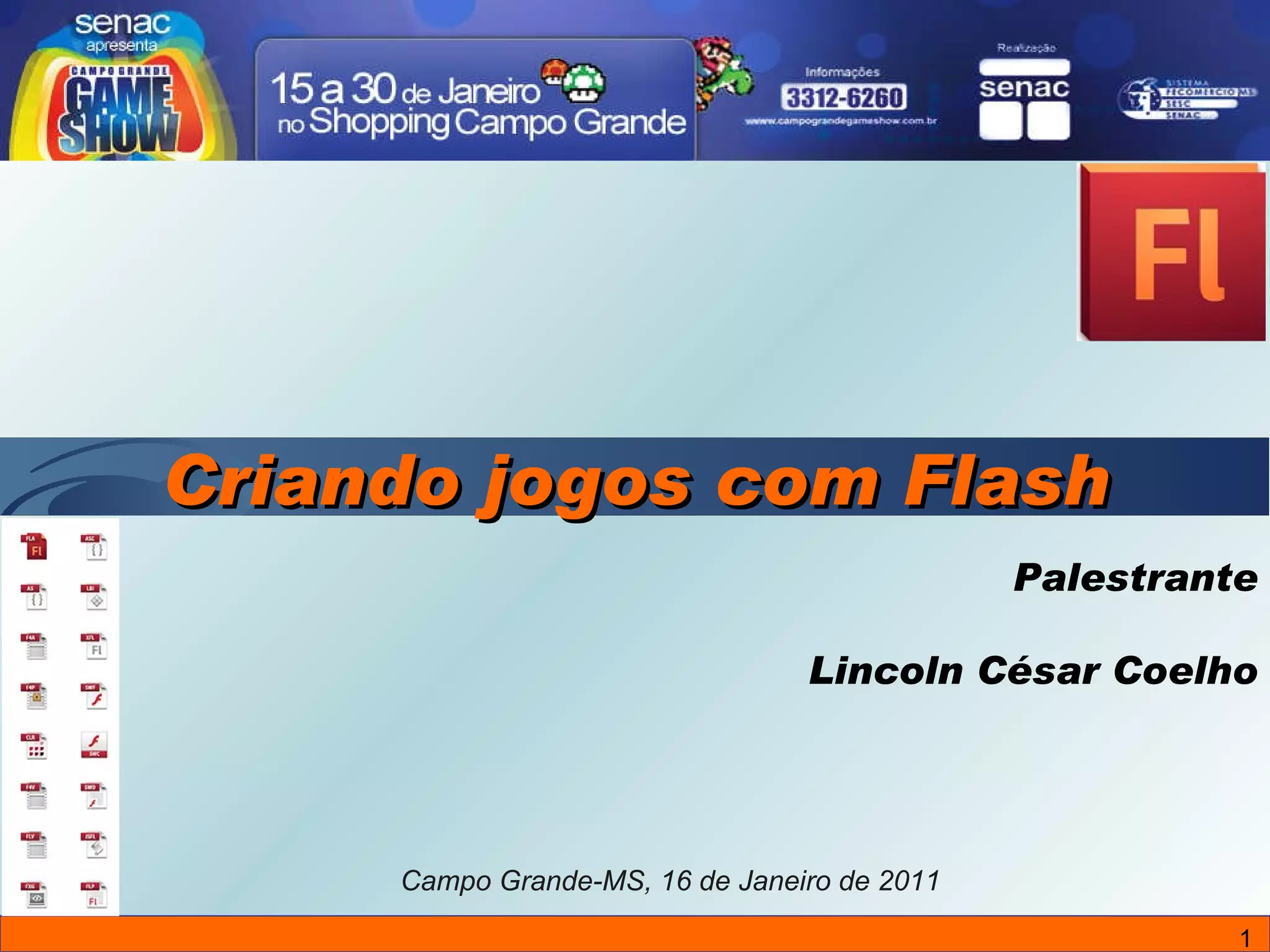 Lincoln César Coelho apresenta a evolução do Flash, desde sua criação na década de 80 até a aquisição pela Adobe em 2005. O documento destaca marcos importantes, como o desenvolvimento do ActionScript e a integração com a Adobe Creative Suite. A apresentação conclui com a menção ao Adobe Flash CS5 e um agradecimento pela atenção.