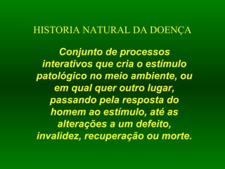 O documento descreve as etapas da história natural das doenças, incluindo a pré-patogênese, patogênese, cronicidade e prevenção. A pré-patogênese envolve fatores sociais, ambientais e genéticos que tornam alguém suscetível. A patogênese inclui a interação entre estímulo e suscetibilidade, alterações bioquímicas e surgimento de sinais e sintomas. A doença pode evoluir para cronicidade, invalidez ou morte. A prevenção inclui