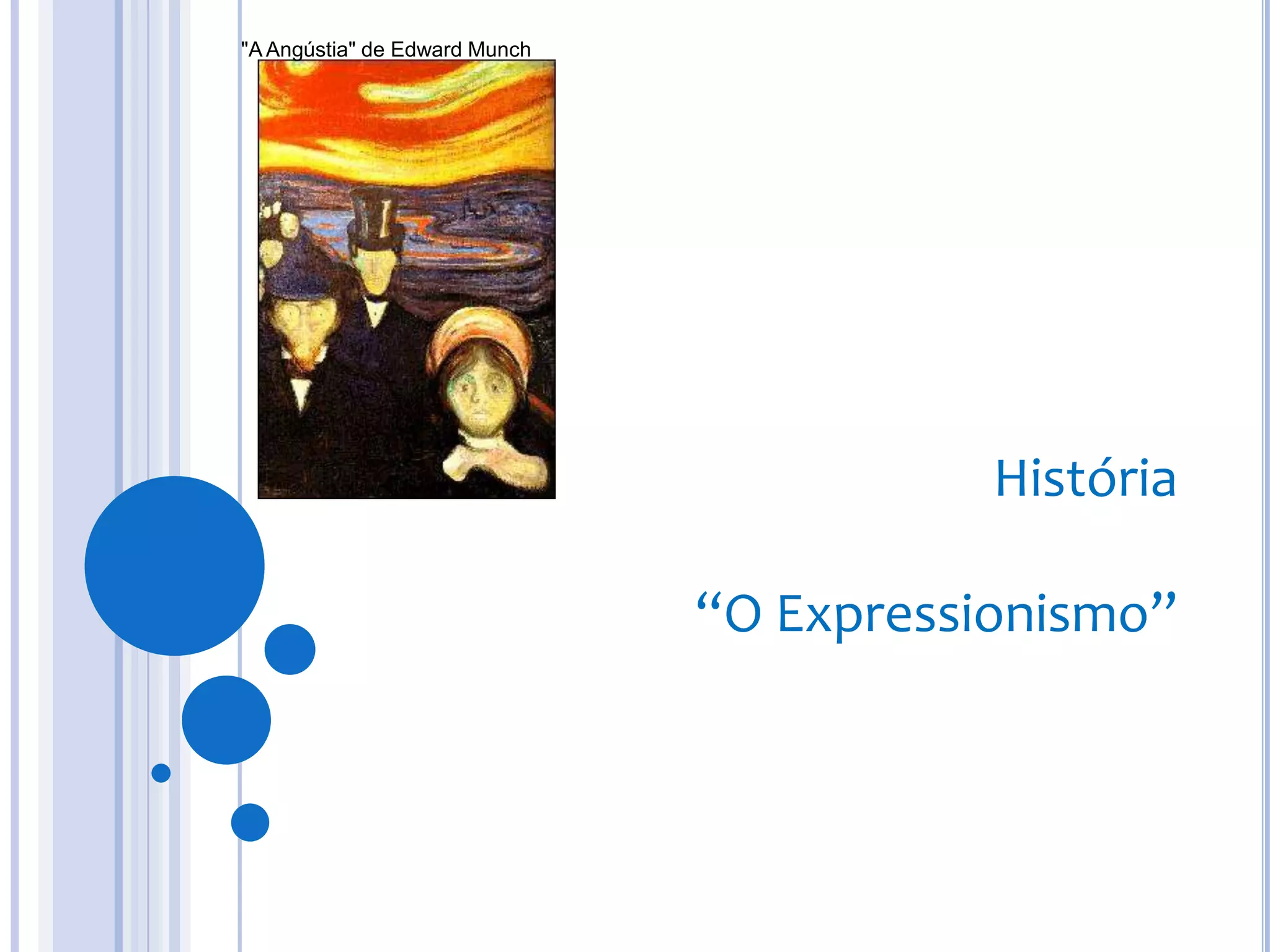 O documento descreve o movimento artístico Expressionismo, caracterizado por cores fortes, deformação da realidade e foco no drama humano. A obra "O Grito" de Edward Munch é analisada como exemplo expressionista, retratando uma figura angustiada. Grandes pintores como Munch, Grosz e Kooning são destacados.
