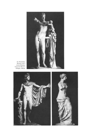 1) Entre 520 e 420 a.C., os artistas gregos conquistaram maior liberdade e consciência de seu poder e habilidade. 2) Diferentes estilos arquitetônicos, como o dórico e o jônico, passaram a ser usados lado a lado. 3) No século IV a.C., esculturas como as de Praxíteles tornaram-se mais graciosas e leves, enquanto os artistas desenvolviam a habilidade de retratar indivíduos.
