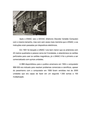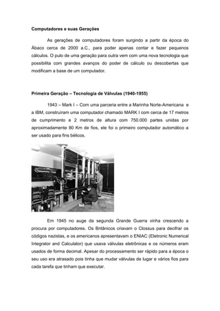 A evolução dos computadores desde o ábaco até os dias atuais, passando por 5 gerações principais marcadas por avanços tecnológicos que permitiram aumentar o poder de processamento. A quinta geração trouxe o Pentium e computadores pessoais com muito mais poder do que modelos anteriores.