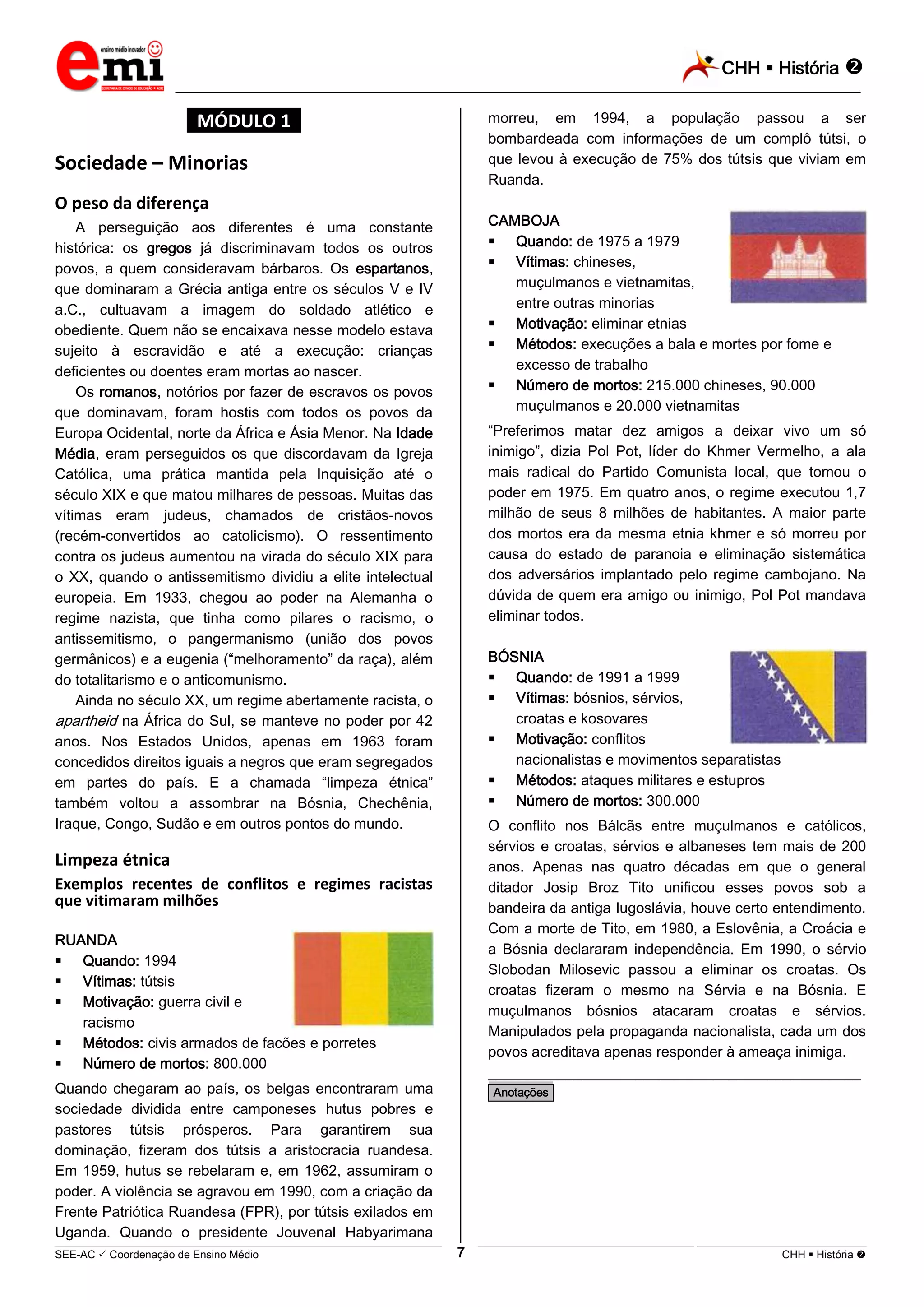 O documento discute a perseguição de minorias ao longo da história, desde a Grécia e Roma antigas até regimes racistas e conflitos étnicos recentes como em Ruanda, Camboja e Bósnia. Também aborda a evolução da aceitação da homossexualidade, inicialmente aceita na Antiguidade mas posteriormente perseguida com a expansão do cristianismo. Por fim, analisa exemplos de genocídio como o Holocausto e o massacre de tútsis em Ruanda.
