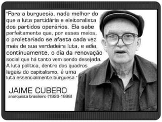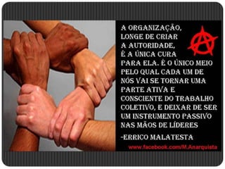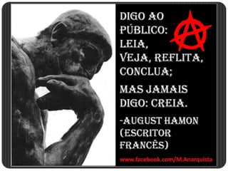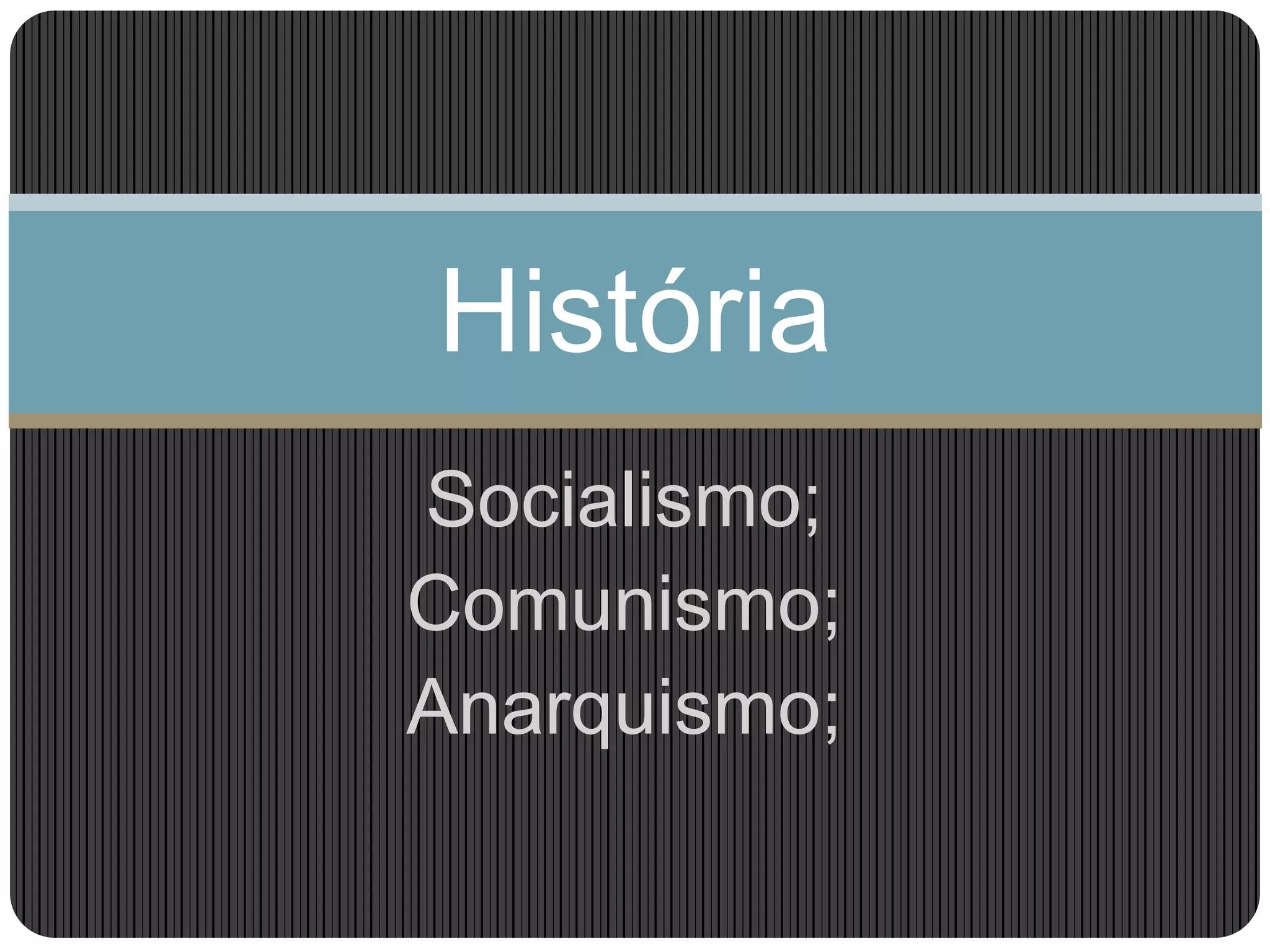 O documento discute três ideologias políticas e econômicas - socialismo, comunismo e anarquismo - fornecendo detalhes sobre suas características e principais pensadores. O socialismo visa a igualdade social através de uma transição para o comunismo liderada por uma burocracia. O comunismo prega a abolição da propriedade privada e uma sociedade sem classes. O anarquismo defende a liberdade individual e a ausência de qualquer autoridade política ou estrutura governamental.