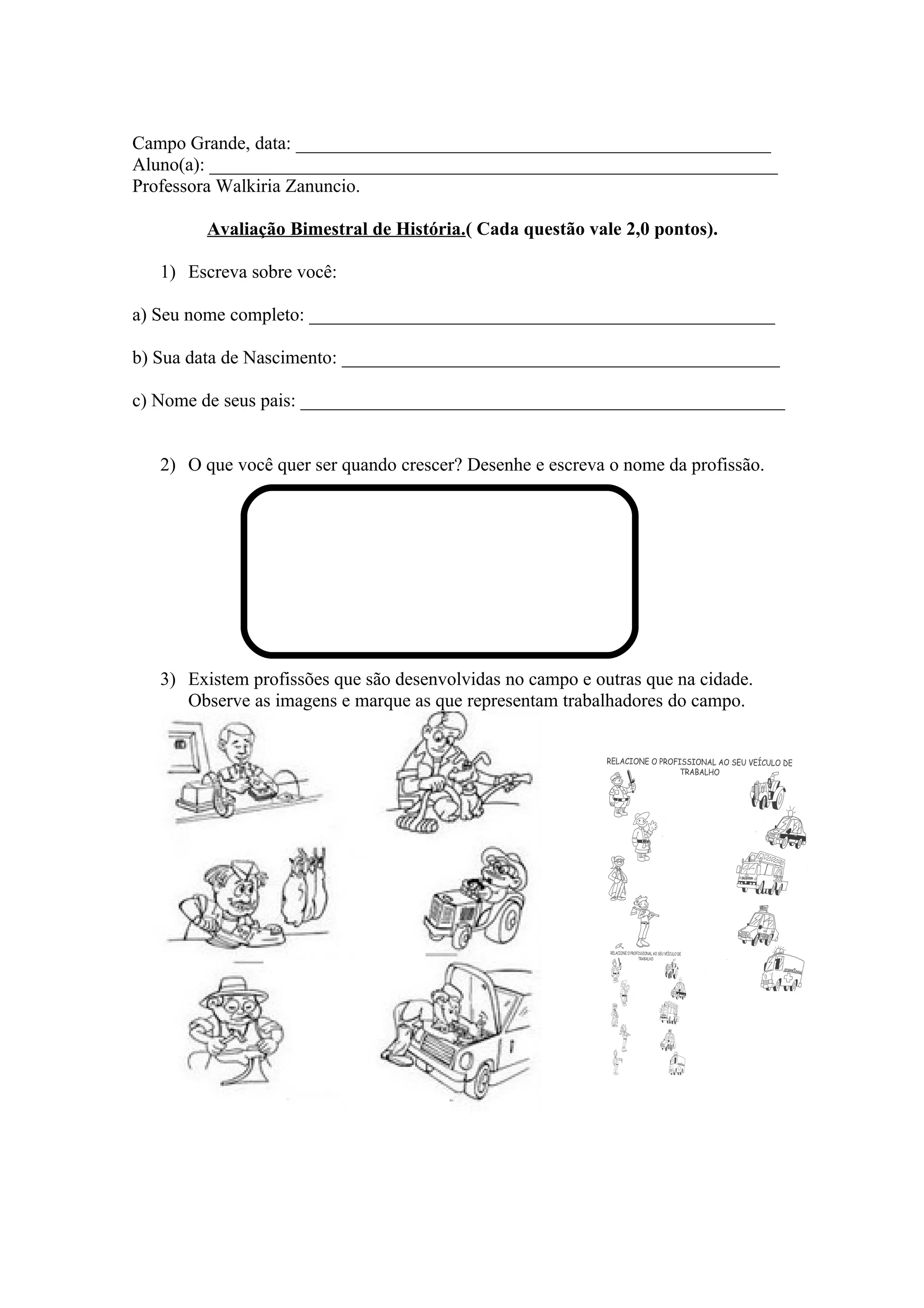 O documento é uma avaliação bimestral de história para alunos. Ele contém perguntas sobre informações pessoais do aluno, profissões futuras, trabalhadores do campo versus cidade, profissionais de saúde e um caça-palavras com profissões. A avaliação enfatiza a importância do conhecimento que não pode ser levado ou deteriorado.