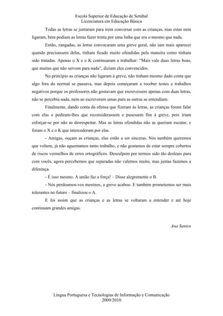Este conto infantil descreve como as letras do alfabeto ficaram descontentes quando as crianças passaram a escrever de forma abreviada e com erros, levando as letras a entrarem em greve. Após as crianças perceberem que precisavam das letras, elas pediram desculpas e prometeram escrever corretamente, fazendo com que a greve fosse suspensa e a amizade entre letras e crianças restaurada.
