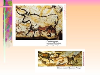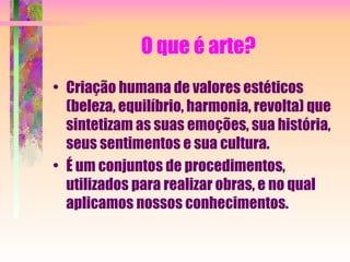 O documento discute o que é arte e fornece um breve resumo sobre a história da arte. A arte rupestre foi a primeira demonstração de arte humana, com vestígios datando de antes das grandes civilizações. A arte rupestre era caracterizada por desenhos feitos com pigmentos naturais em cavernas, retratando animais, pessoas e cenas de caça.